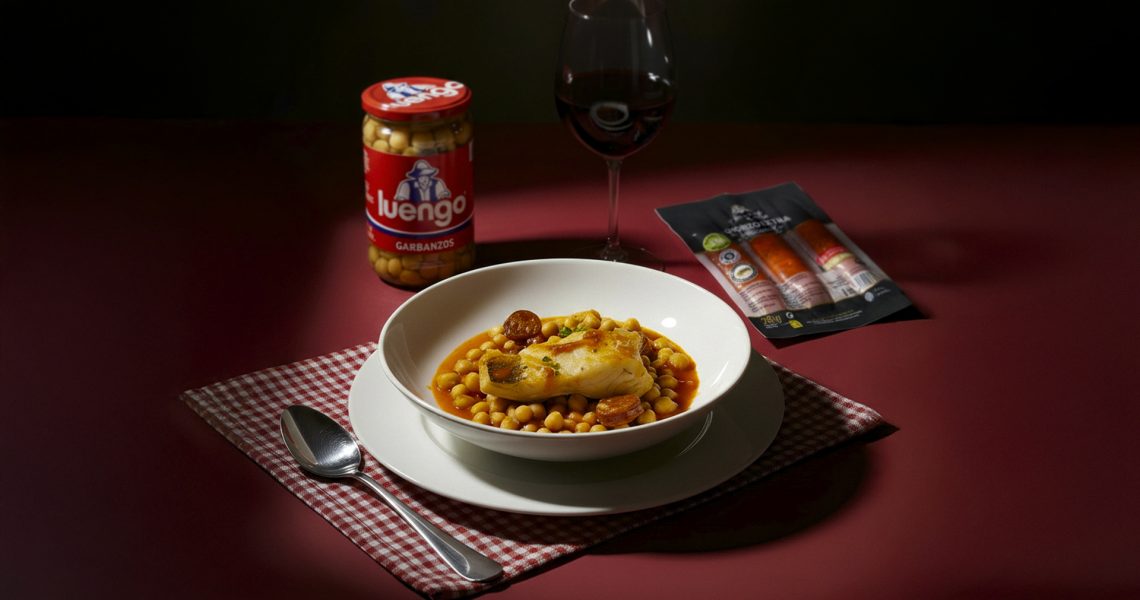 Hay platos que saben a casa, a cocina lenta y a cuchara. Este bacalao con garbanzos y chorizo es uno de ellos. Un guiso sencillo, de los que se hacen con buenos ingredientes y tiempo, donde el bacalao se cocina lo justo y el chorizo Torre de Núñez aporta ese punto de sabor tan nuestro que lo redondea todo. Usamos garbanzos cocidos de Legumbres Luengo, para una elaboración rápida, sabrosa y nutritiva , que nos dan el equilibrio perfecto en este plato.